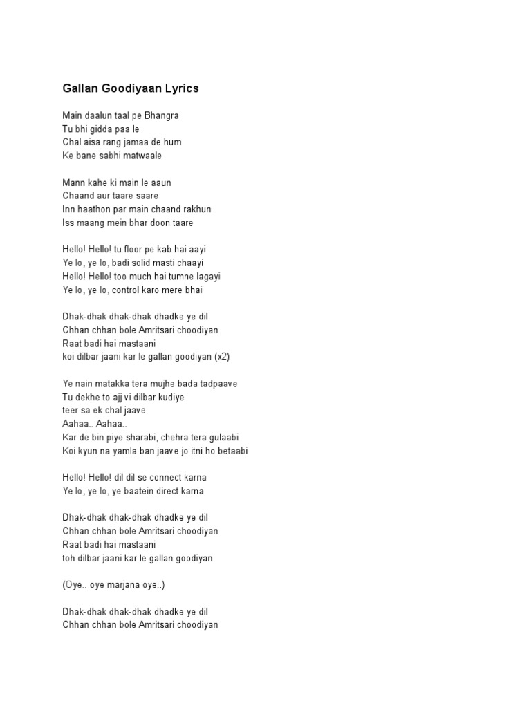 Gallan Goodiyaan Lyrics - Read gallan goodiyaan from the story bollywood songs lyrics by shabfurreedun with 551 reads.